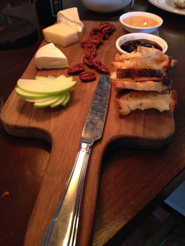 We started with some red wine and a cheese platter, complete with candied pecans, green apple, honey, and berry compote.