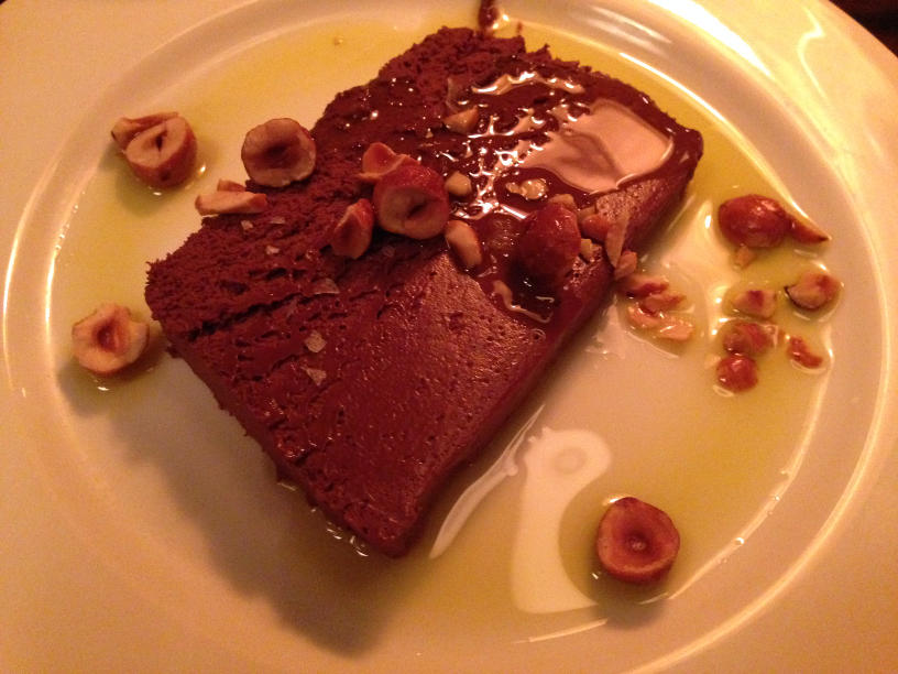 Then after some red wine, I finished the meal with the chocolate marquise. I was surprised to learn that my rich, chocolate dessert came with candied hazelnuts and… olive oil.